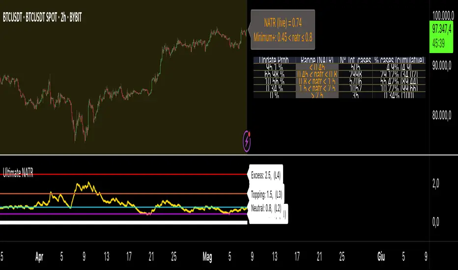 Update (downgrade) #3- Downgrade Update: It will no longer be possible to use this indicator with all its previous features. In the coming days, a private version will be released, accessible through a series of steps that will be shared here as a further update to the script. This version will remain public, but tables, labels, and the Dynamic version with its standard deviations will be hidden. The full version will be called "Ultimate NATR – Pro."