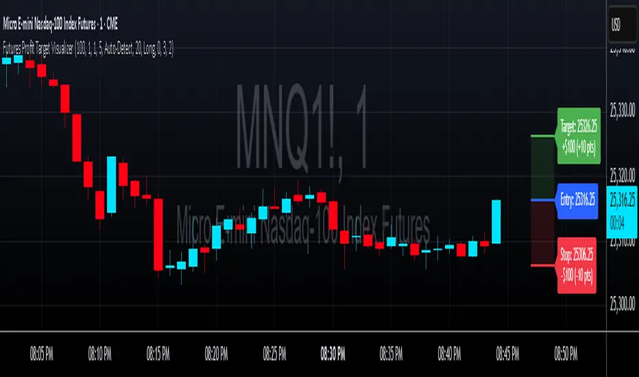 It auto-detects the futures contract you're viewing (NQ, ES, MNQ, MES, etc.) and calculates the correct point value automatically.