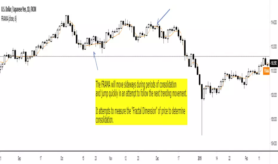 Here we measure the "fractal dimension" in order to differentiate periods of consolidation and trend. The trendline will run relatively flat during ranging price movement and quickly follow trending price action.