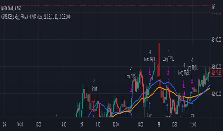 The script is an advanced technical analysis tool specifically designed for trading in financial markets, with a particular focus on the BankNifty market. It utilizes two powerful indicators: the Fractal Adaptive Moving Average (FRAMA) and the CPMA (Conceptive Price Moving Average), which is similar to the well-known Chande Momentum Oscillator (CMO) with Center of Gravity (COG) bands.