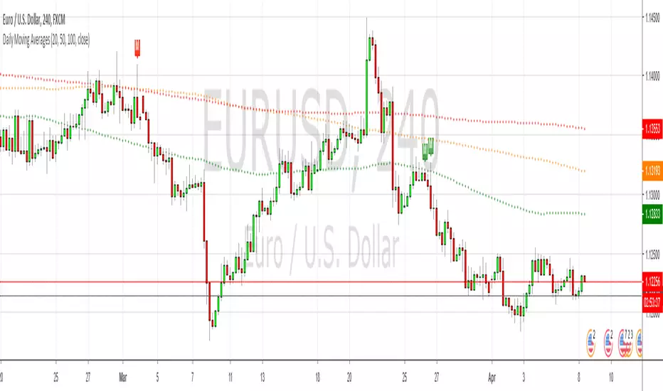 Plots the 20, 50, 100 & 200 daily moving averages on any lower timeframe, but it uses a custom function to calculate the plots rather than using the security() function, so the lines are smooth rather than jagged.
