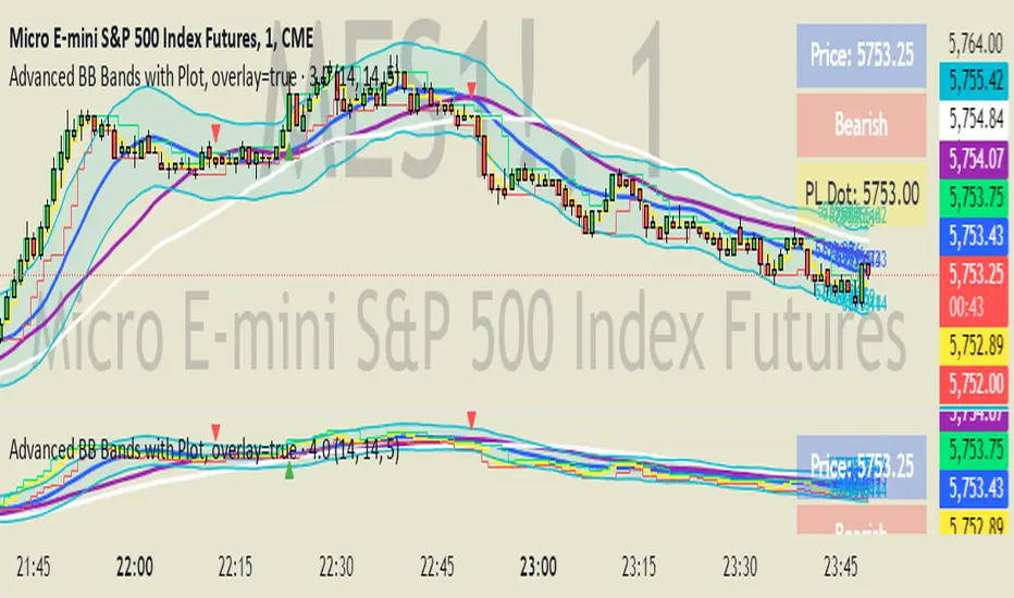 This code implements an advanced version of Bollinger Bands with additional moving averages, ATR-based bands, step lines, market direction indicators, and real-time data display. Here’s a breakdown of the functionality: