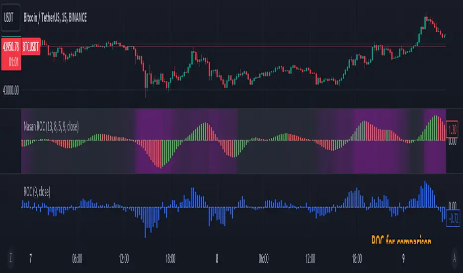 **NOTE: FOR COMPARISON TRADITIONAL ROC IS PLOTTED WITH THE SAME ROC LENGTH OF 9. IT IS NOT PART OF THE INDICATOR"