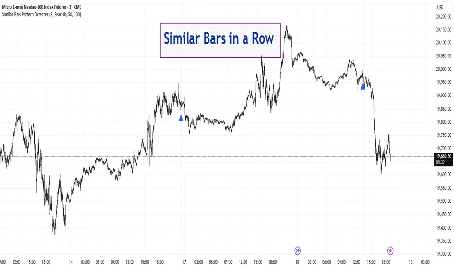 The Similar Bars Pattern Detector is a professional Pine Script indicator designed for TradingView users who want to identify sequences of similar candlesticks in a row. Whether you're looking for bullish or bearish patterns, this tool helps you spot repeating formations based on customizable settings.