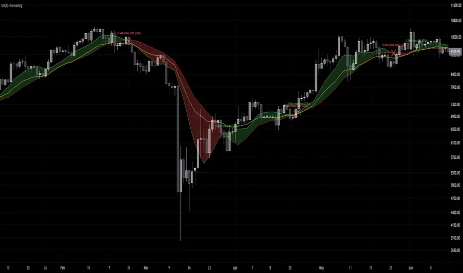 Simply put, MA(X) + Forecasting is a moving average cross visualizer which allows the end-user to enter two user defined moving averages, each with their own length, source, and type, to create the visualized ribbon, as well as the option for an additional three separate moving averages, all with their own length, source, and type enabling MA(X) the flexibility to be used for any one of your favorite moving average strategies or in conjunction with another for added confluence.