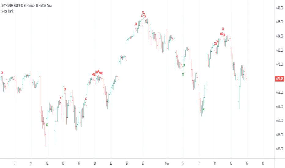 Oversold/Buy: A 🟢 Green X is generated only when the slope ranking indicates the market is steeply negative (oversold), and the slope value begins to tick upwards (the inflection point), signaling potential mean reversion.