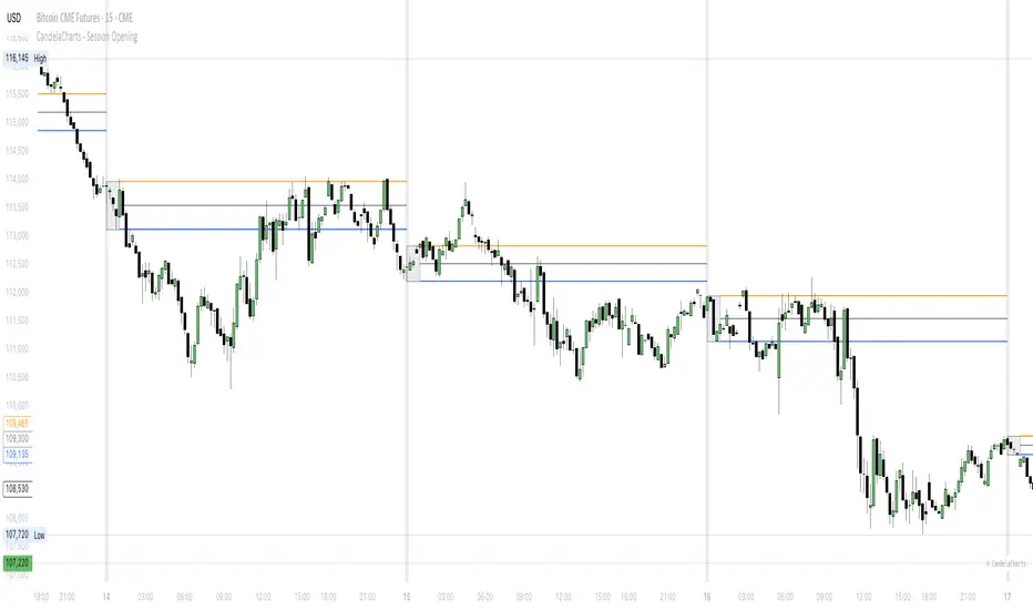 The CandelaCharts – Session Opening indicator highlights a custom session window, builds the live high/low as the session unfolds, and then publishes finalized Range High, Range Low, and Consequent Encroachment (Mid) levels once the window closes. A subtle one‑bar divider marks each new session start, and a shaded box visualizes the evolving range while the session is active.