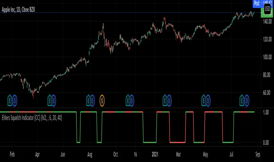 The Squelch Indicator was created by John Ehlers (Stocks & Commodities V. 18:9 (42-46)) and this indicator is a variation of his Market Mode Indicator and its purpose is the same as in it determines if the market is trending or in a choppy market. If this indicator is at the 1 level then this means the market is trending and if it is at 0 then the market is choppy. I would recommend to adjust the squelch variable to find a setting that works well for you. If you want to avoid more choppy markets then adjust the squelch variable to a lower amount and vice versa. I have included basic buy and sell signals so buy when the line turns green and sell when it turns red.