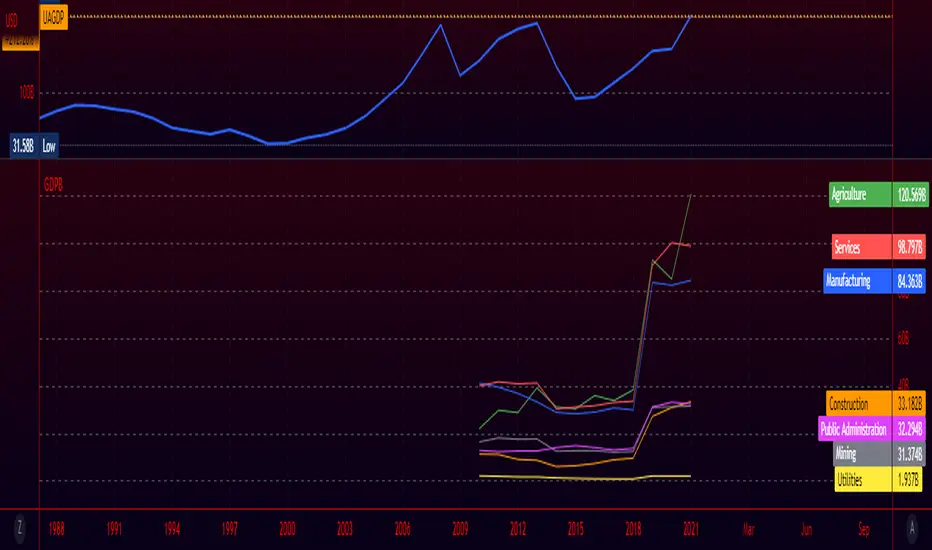 Provides an easy way for viewing the sub sections that make up a country's total GDP. Not all countries provide data for each subsector (Agriculture, Construction, Manufacturing, Mining, Public Administration, Services, Utilities). Only countries that provide complete data are able to be selected in the settings. If I've missed any please let me know in the comment section so they can be added. This is much easier than having to individually selecting each ticker for each country when looking to compare how diversified an economy is.