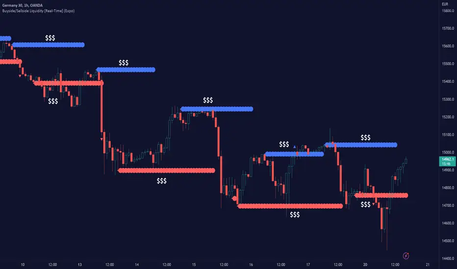 Buyside/Sellside Liquidity [Real-Time] (Expo) is an indicator that identifies buy-side and sell-side liquidity in real time. Buy-side liquidity represents a level on the chart where short sellers will have their stops positioned. Sell-side liquidity represents a level on the chart where long-buyers will place their stops. These levels are found in areas where traders are "proven wrong" and, therefore, want to get out of their trades. Smart money will accumulate or distribute positions near these levels where many stops are placed and absorb all provided liquidity.