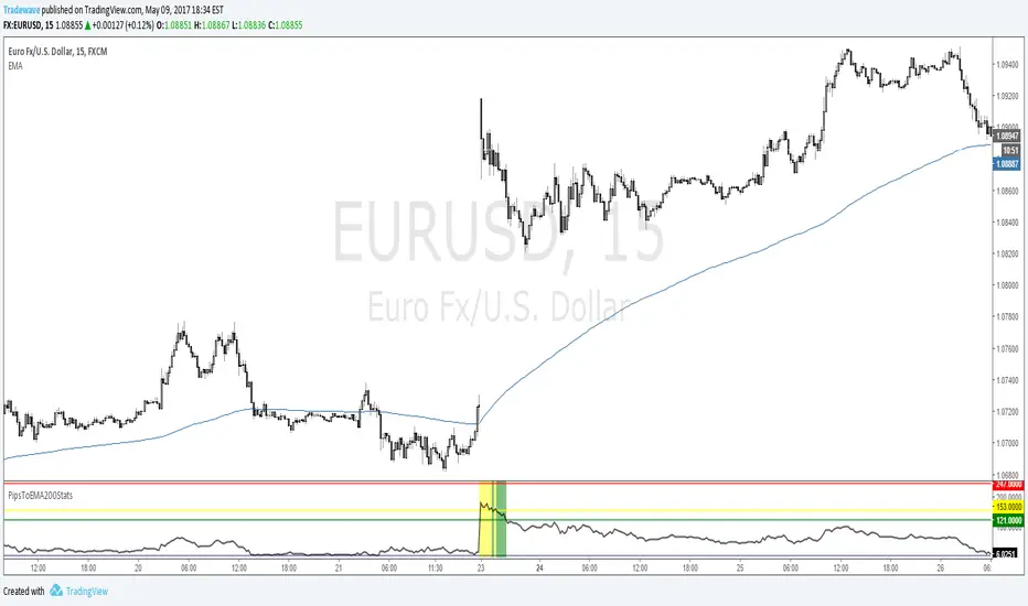 Displays thresholds for vertical pip distance to 200 EMA calculated from 10 years worth of historical data.