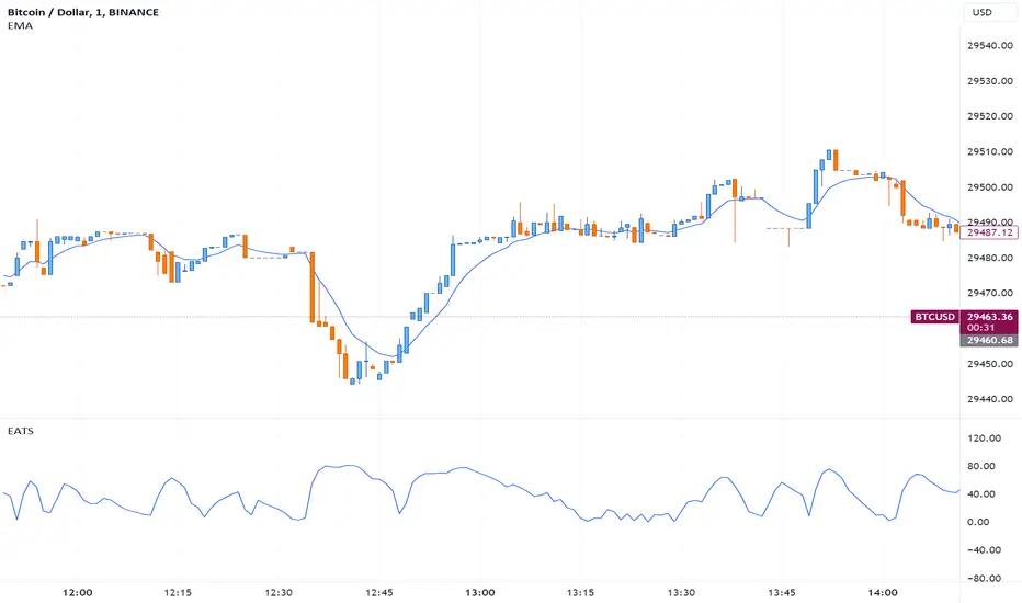 EATS is an innovative indicator that calculates the slope of the exponential moving average (EMA) over a defined number of candles, presenting this on a scale of 0 to 100.