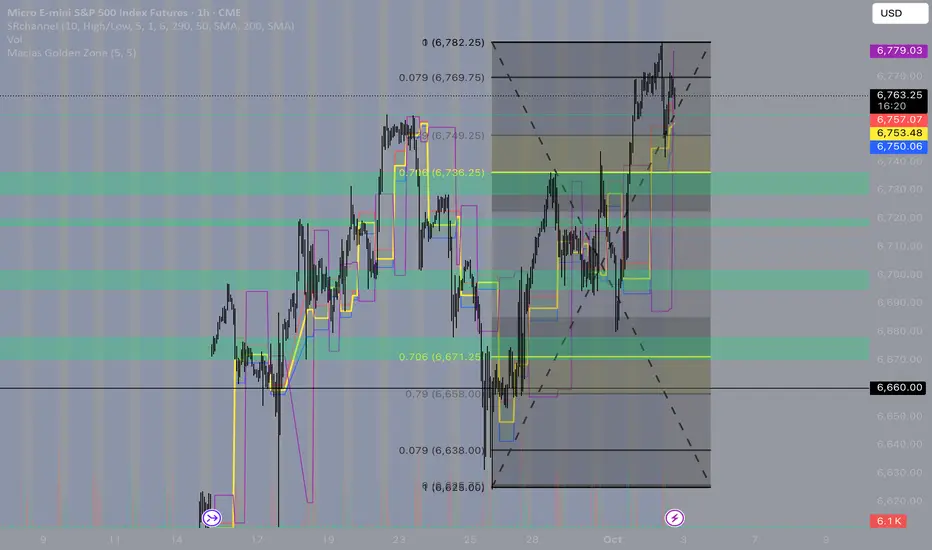 The Macias Golden Zone indicator automatically detects the most recent pivot leg and draws the key Fibonacci retracement band between 0.618 – 0.790, with the 0.706 midline highlighted.