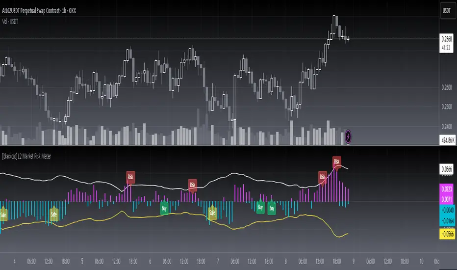 The [blackcat] L2 Market Risk Meter is designed to evaluate market conditions using various technical indicators including Moving Averages (MA), Moving Average Convergence Divergence (MACD), and Bollinger Bands 📈🔍. By analyzing these elements, the script helps traders identify potential buying opportunities and assess the overall market sentiment more effectively. This comprehensive approach aids in making informed trading decisions by providing clear visual representations of critical market factors 🚀💸.