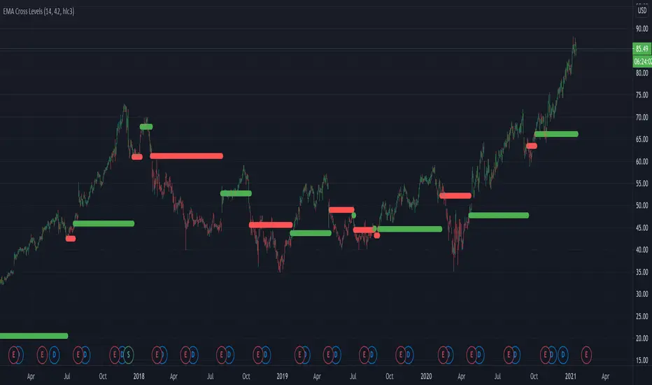 Plots the price level of the most recent cross. If bullish cross (fast crosses up over slow), color = green, and color=red if cross was bearish.