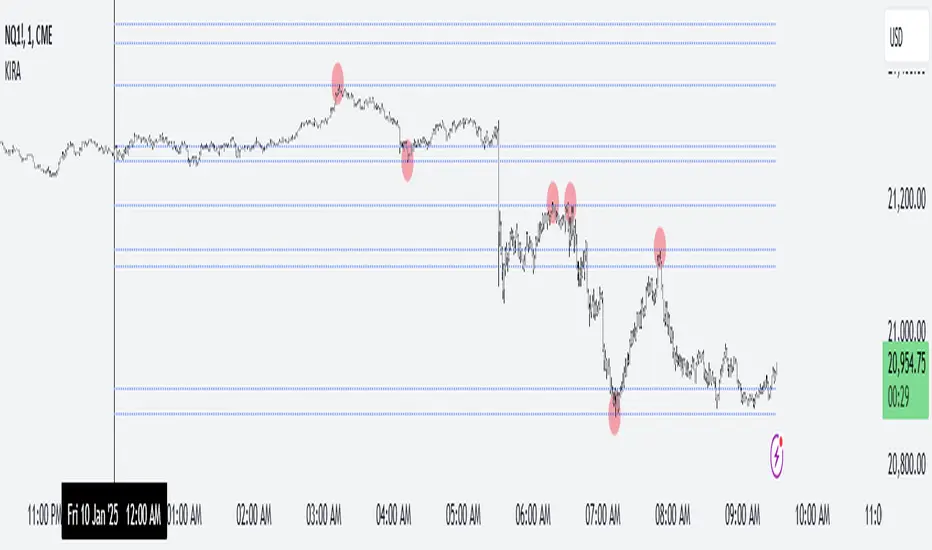 The chart accompanying this script provides a clean visualization of the KIRA levels applied to a 1-minute chart of [NQ]. All outputs are directly from the KIRA script to ensure clarity and ease of use.