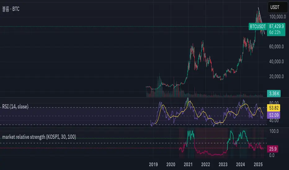 market relative strength is a custom indicator that visualizes how strong or weak a given asset is compared to a selected market benchmark — such as KOSPI, NASDAQ100, BTC dominance, or total crypto market cap.