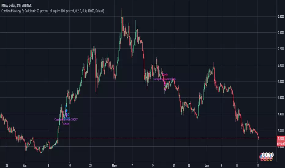 Estratégia para o par Iota/usd de médio/longo prazo. Utilizar em 4h. Para melhor obtenção de resultados recomendo o seguinte: Insira o capital que você irá utilizar nessa estratégia e limite a trabalhar apenas com esse capital sempre, mantendo um stop curto, pois nenhum script é 100% rentável. Como é uma estratégia de médio/longo prazo ele não vai dar entrada no fundo ou no topo, ele da entrada confirmando a tendência de médio/longo prazo. É bacana você ter em mente uma margem de lucro satisfatória e quando bater essa margem de lucro você pode fechar a operação e aguardar o próximo sinal para entrar novamente na operação diminuindo ainda mais os riscos. Bons lucros.