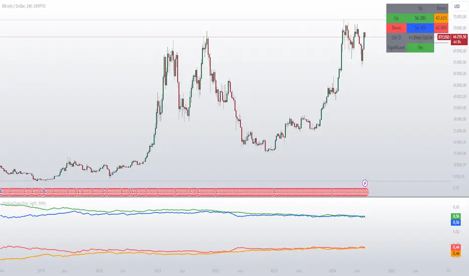 This script uses a Markov chain to calculate closing price transition probabilities across the entire accessible chart. It displays the probabilities of the following transitions: