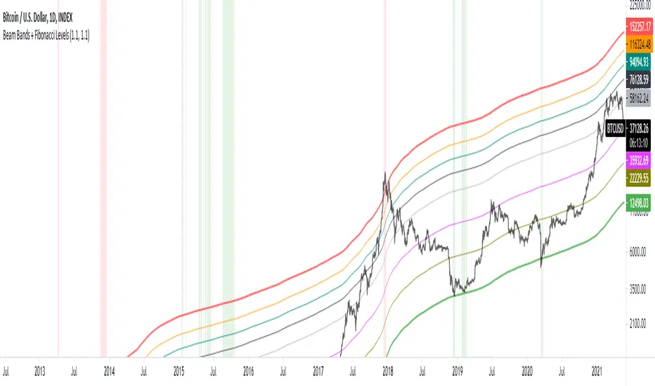 This indicator calculates the Fibonacci retracement levels based on beam bands. As you can see the price very often reacts to these levels.