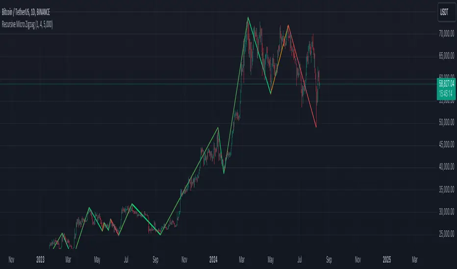 Recursive Zigzag Expansion: Building upon the Micro Zigzag base, the indicator applies the Recursive Zigzag concept to derive higher-level zigzags. Through recursive analysis of the Micro Zigzag's pivots, the indicator uncovers intricate patterns and trends that may not be evident in single-level zigzags.