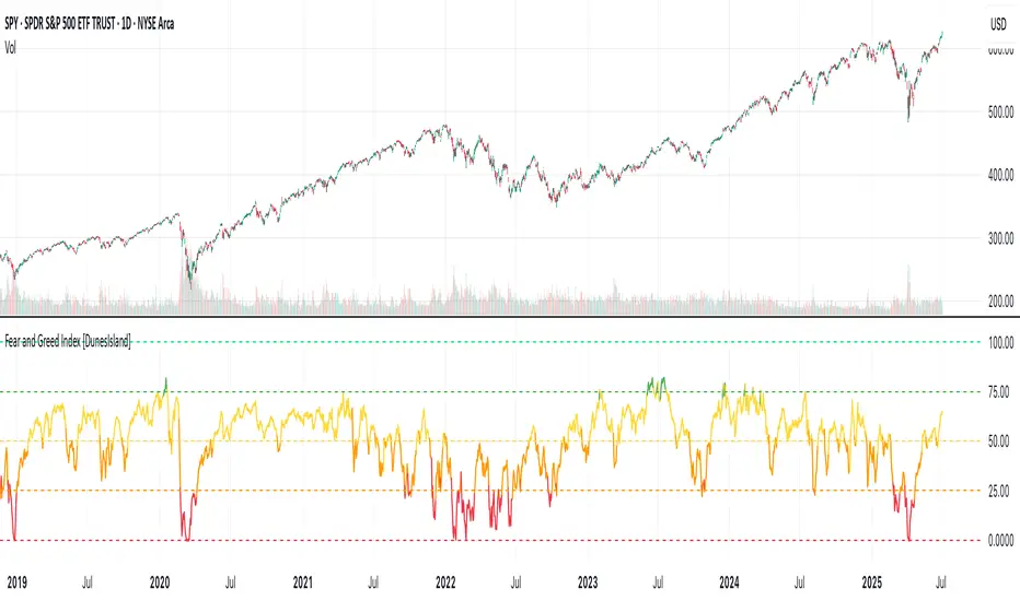 The Fear and Greed Index [DunesIsland] is a sentiment indicator designed to measure the emotions driving the stock market, specifically investor fear and greed. Fear represents pessimism and caution, while greed reflects optimism and risk-taking. This indicator aggregates multiple market metrics to provide a comprehensive view of market sentiment, helping traders and investors gauge whether the market is overly fearful or excessively greedy.How It WorksThe Fear and Greed Index is calculated using four key market indicators, each capturing a different aspect of market sentiment: