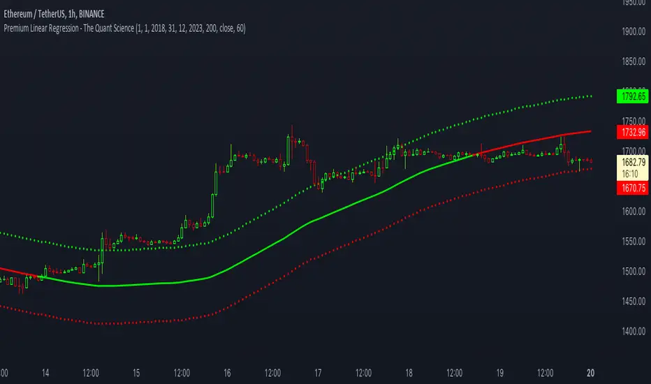 The indicator is designed for multi-timeframe use and to facilitate analysis for traders who use regression models in their analysis. It displays a green linear regression line when the price is above the line and a red line when the price is below. The indicator also highlights areas of dispersion around the regression using circles, with bullish areas shown in green and bearish areas shown in red.