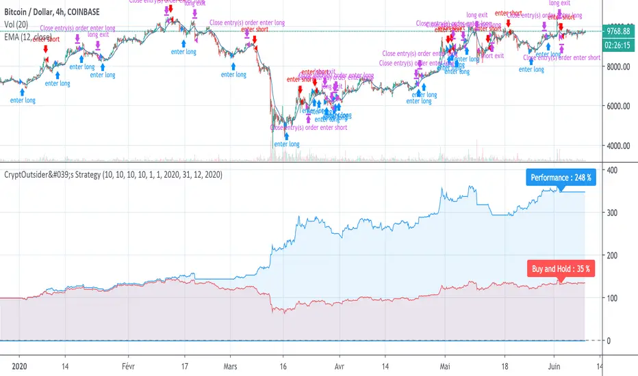 The present script is a BTC strategy backtest tool based on a proprietary algorithm. The performance calculated (blue on the graph) is compared to a "Buy and Hold" position (red on the graph). You can also compare it with other published strategies or even your own one !