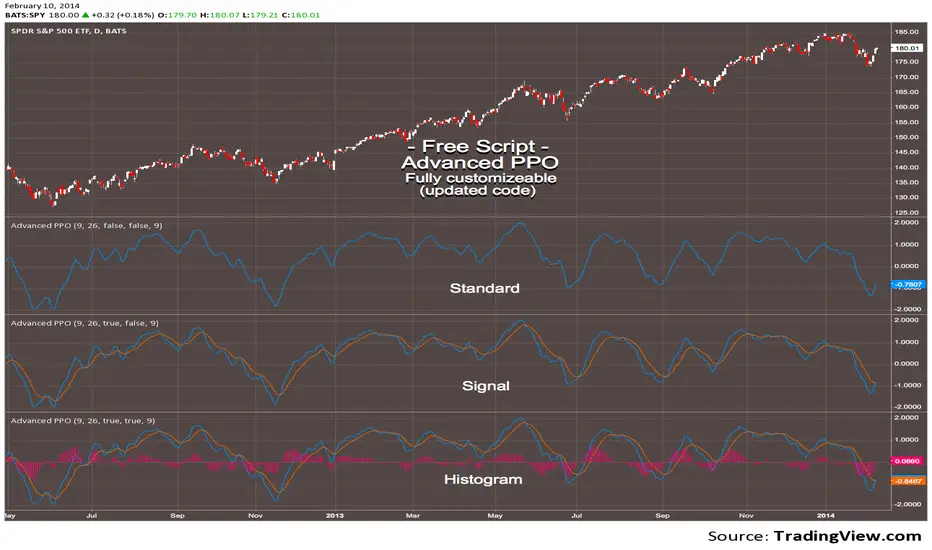 I felt the PPO offered here was a bit basic, so turned it more into the MACD's look and feel, except this is fully customizable through the options menu for non-coders to make it look exactly as they wish.