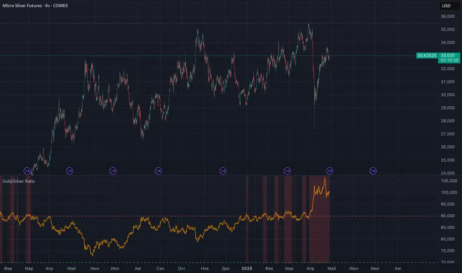 This indicator displays the Gold/Silver Ratio by dividing the price of gold (XAUUSD) by the price of silver (XAGUSD) on the same timeframe. It is a widely used tool in macroeconomic and precious metals analysis, helping traders and investors evaluate the relative value of gold compared to silver.