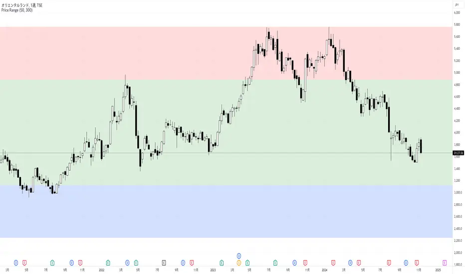 This indicator displays low, middle, and high price zones based on the lowest and highest prices over a specified period, using color-coding. This helps users visually identify the current price's position within these zones.
