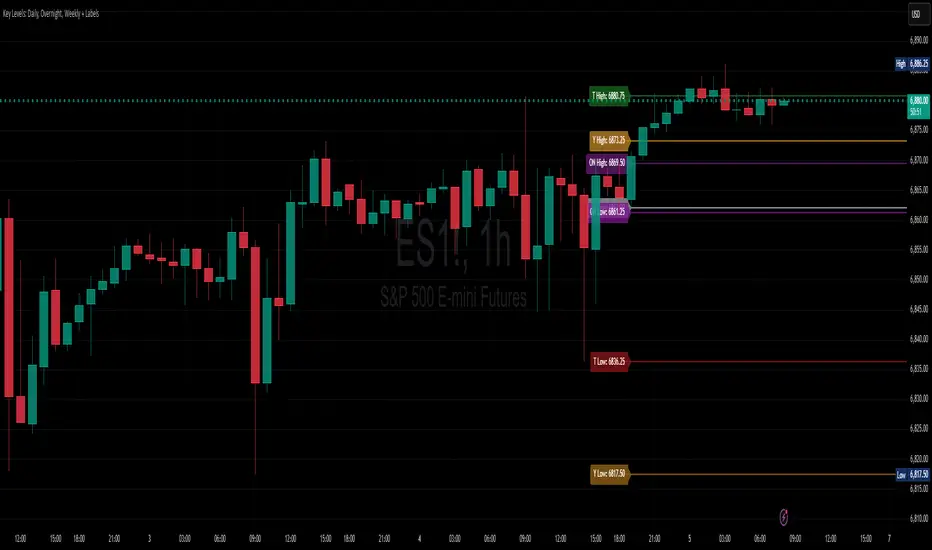 Automatically detects the Globex / Overnight session (4:00 PM–4:00 AM) and tracks: