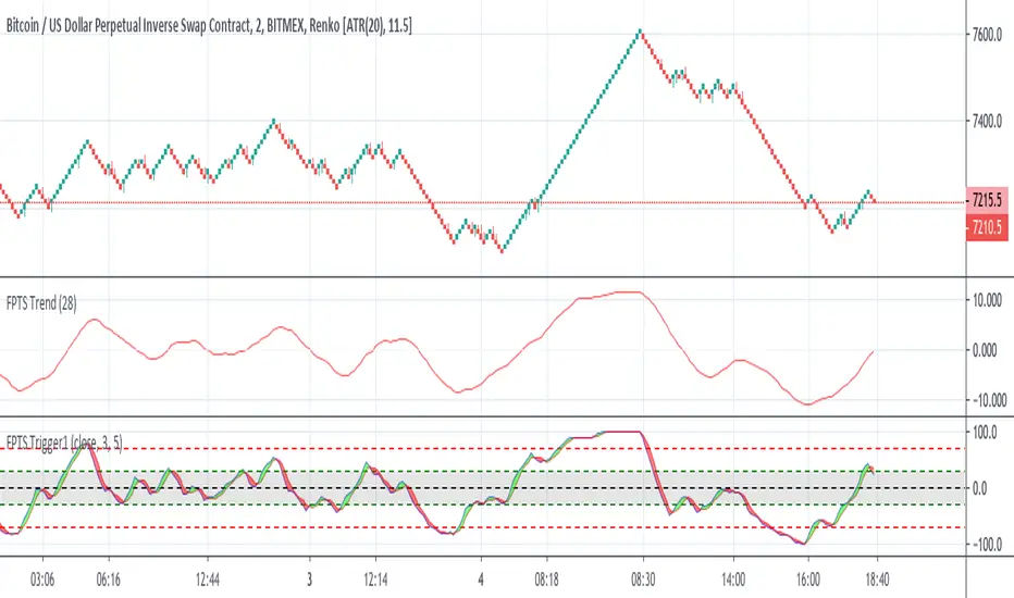 Fine Tuning the system... you can change values of the trend indicator until the line starts to match the rhythm of the renko chart. Different assets act different and so fine tuning will improve the probability of a successful trade.