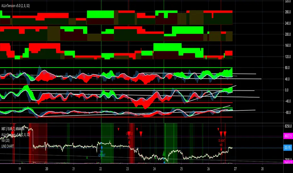 Backtesting means you can test each TimeFrame (best 1-9min) with various AllinTension indicator settings. You will get a result for profitability in the last period (but it is not that important anything but for maybe feeling bad you missed it), success rate in percent (anything above 70% is good enough) and you have to watch the ratio of the max dropdown and average trade size (least acceptable is -5x, better is 2x or less).