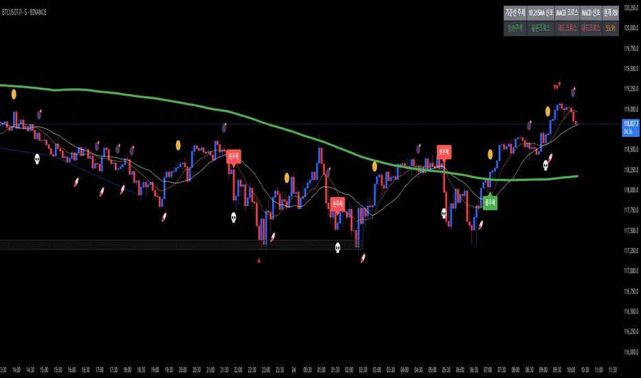 This is a signal indicator that combines MACD, RSI, and three moving averages. When all signals match, the entry signal is determined based on the golden cross/death cross of the moving averages.