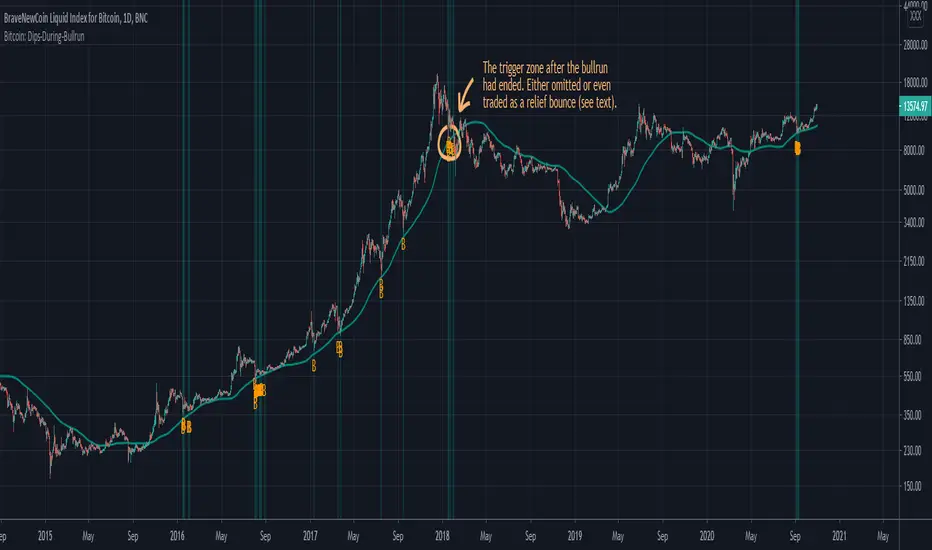Note that this algorithm is rather rudimentary, and it will also trigger in one more zone after the bullrun has already ended (marked on the chart above), as the first retest of the MA(20W) shows similar behaviour in the RSI as during bullrun dips. However with other indicators DeanTrader provides (as e.g. the "Bitcoin: Price Action Integrals", and the "Bitcoin: Top & Bottom Mini-Algo" indicators), it should be possible to determine when the bullrun has roughly ended to then discard this indicator until the next bull phase starts sometime in the future. Also some people might even want to trade the relief bounce based on that after-bullrun trigger.