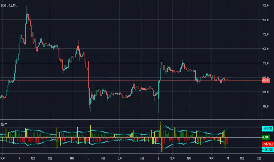 FORCE indicator calculates the pressure of buyer and seller in each candle based on volume, price, and shape. It outputs leading volume over that period and its relative strength.