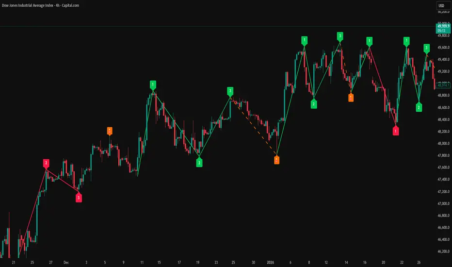 This indicator attempts to stay as close as possible to Elliott's original method. The algorithm uses Pivot Point detection (ta.pivothigh / ta.pivotlow) to objectively identify tops and bottoms.