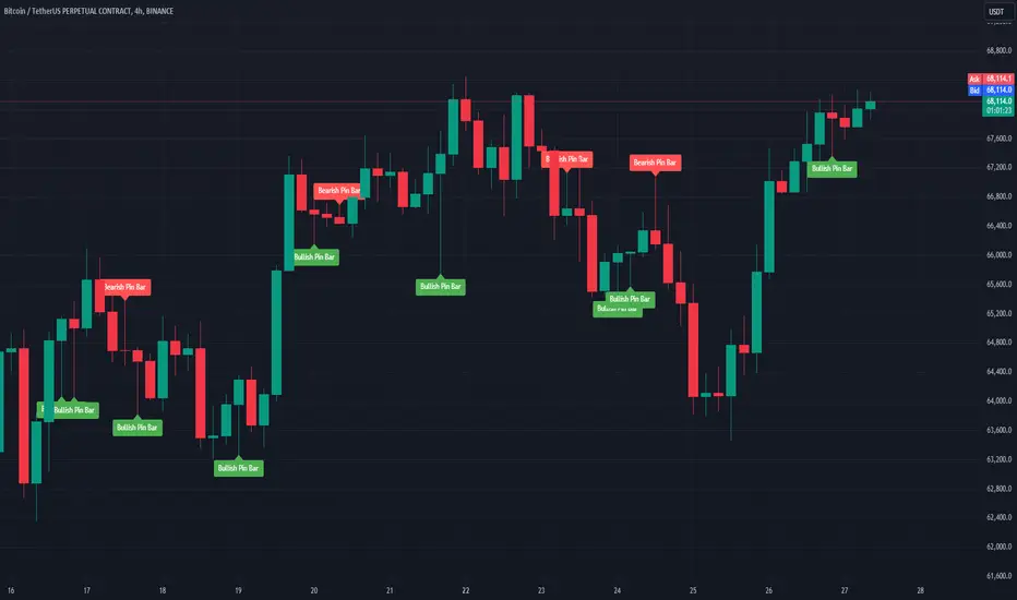 This Pine Script indicator is designed to be the best tool available for detecting pinbars in the market. It focuses on specific conditions to identify pinbars accurately and suggests a strategy using Fibonacci levels for trading. There is no other indicator on TradingView capable of what this indicator does, making it unique and highly valuable for traders.
