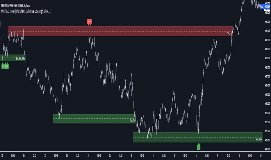 Flux Charts supply and demand script utilizes MTF. This allows for displaying zones from different timeframes on one chart. Utilizing higher timeframes is a common practice in trading, and it can be easy to forget about key levels & zones on higher timeframes which could cause reversals/bounces.