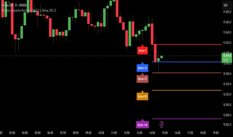 The "Fibonacci Sequence Numbers" indicator overlays horizontal lines on a trading chart based on Fibonacci sequence values (0, 34, 55, 89, 144, 233, 377, 610) relative to a user-defined reference price and time. Users can specify the direction ("Above," "Below," or "Both") to plot these levels above and/or below the reference price, with customizable line length, width, and colors for each level (e.g., red for Level 0, blue for 34). A vertical dashed line marks the reference time, while horizontal lines extend rightward, accompanied by labeled annotations shifted slightly left for clear view.