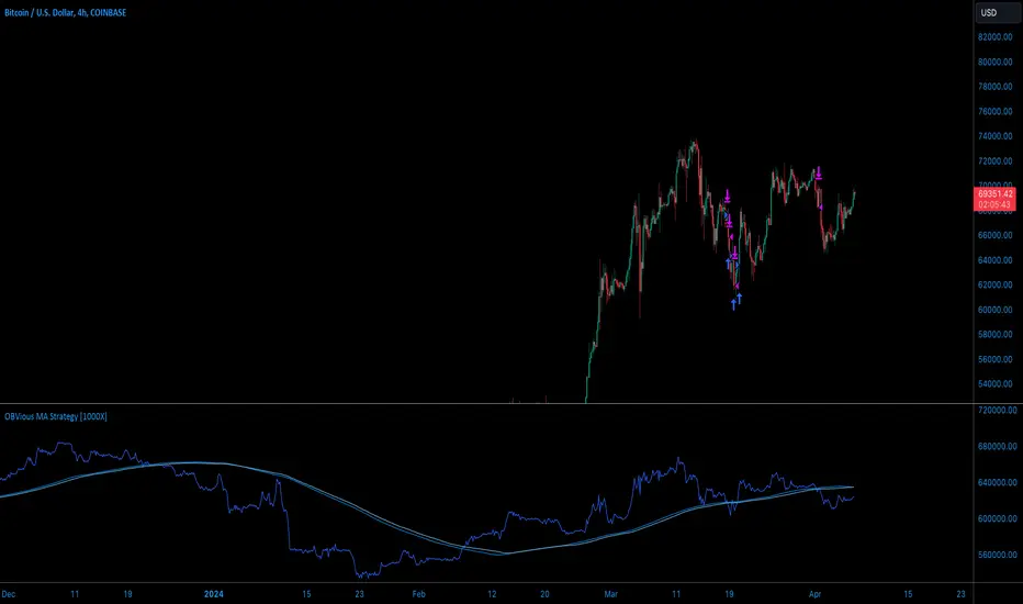 This strategy demonstrates one method of utilizing OBV to your advantage. I call it the "OBVious MA Strategy [1000X]” only because it is so simple in its mechanics. This is meant to be a demonstration, not a strategy to utilize in live trading, as the primary utility of the OBVious MA indicator is as a volume confirmation filter that complements other components of a strategy. That said, I felt useful to present this indicator in isolation in this strategy to demonstrate the power it holds.