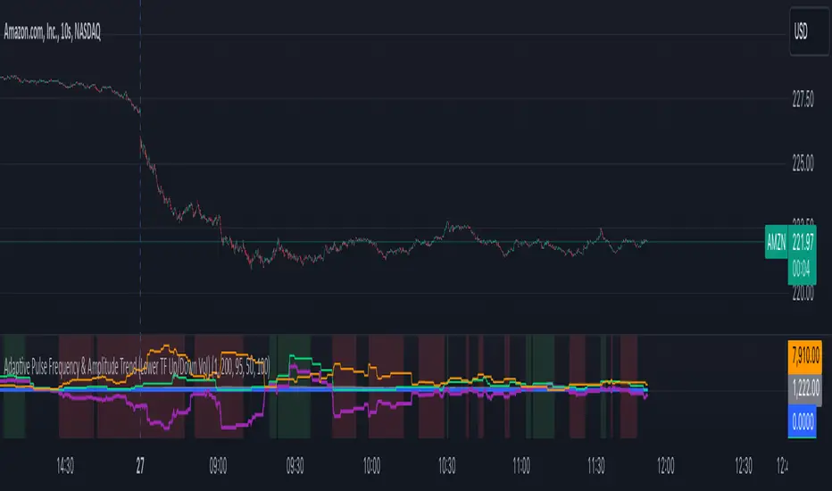 The Adaptive Pulse Frequency & Amplitude Trend Indicator is a Pine Script-based tool designed for lower timeframe volume analysis and trend detection. By analyzing volume dynamics and identifying significant "pulses" in market activity, this indicator provides insights into bullish and bearish trends. Here's an overview of its key features and components: