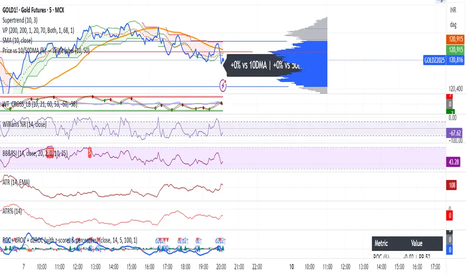 This indicator measures how price momentum is changing — not just whether it’s rising or falling, but how quickly that change itself is accelerating or slowing. It starts with the Rate of Change (ROC), which shows how much price has moved over a set period. The first derivative (ΔROC) tracks how ROC is changing from bar to bar, and the second derivative (Δ²ROC) shows whether that change is speeding up or fading — essentially the “acceleration” of momentum. Positive Δ²ROC means momentum is strengthening; negative means it’s weakening. The script also quantifies how extreme those shifts are using z-scores and percentiles, helping spot Druckenmiller-style turning points where trends often begin or end.