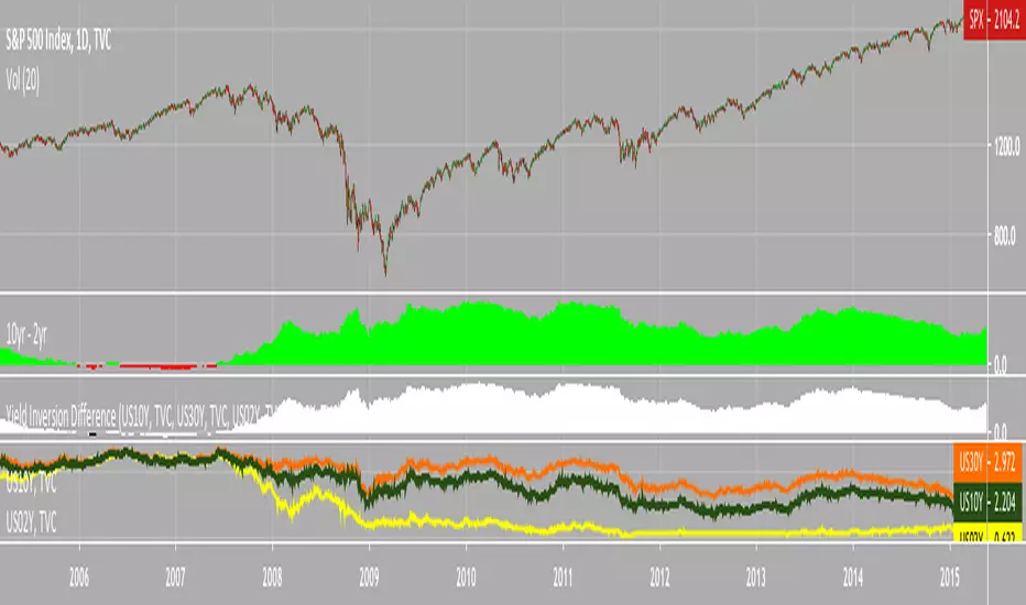 Displays the yield inversion difference on bonds between short term and long term bonds.