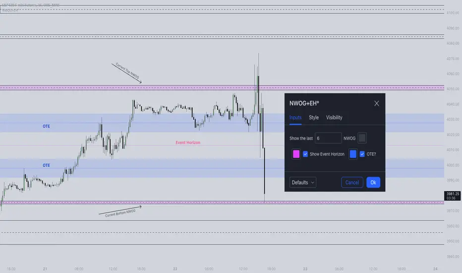 I decided to put all of these into an indicator that dynamically selects the most relevant NWOG Dealing Range and plots their EH and OTE levels automatically.