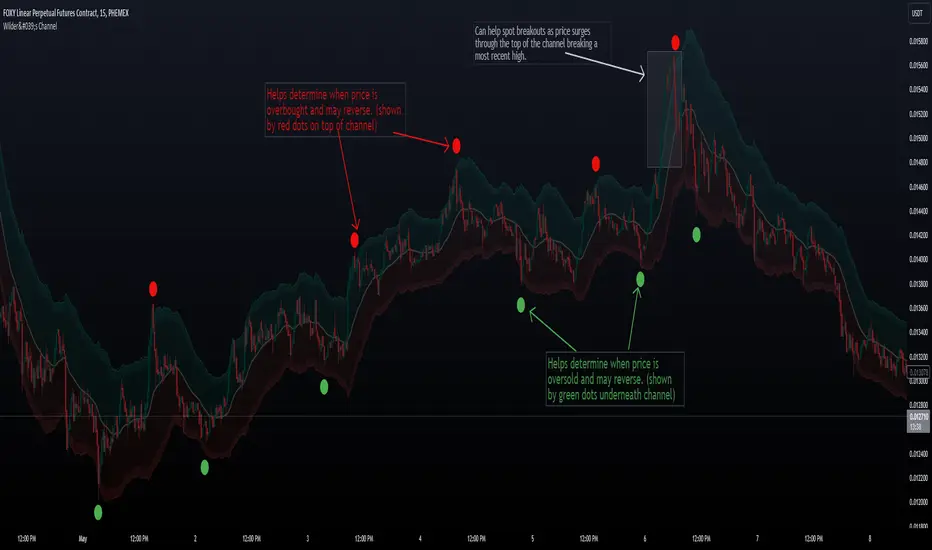 "Wilder's Channel," which is plotted on the chart overlay to assist traders in visualizing potential support and resistance levels. This script uses a combination of Wilder's Moving Average and the Average True Range (ATR) to create a channel around price movements. Here's a breakdown of how it works and its benefits: