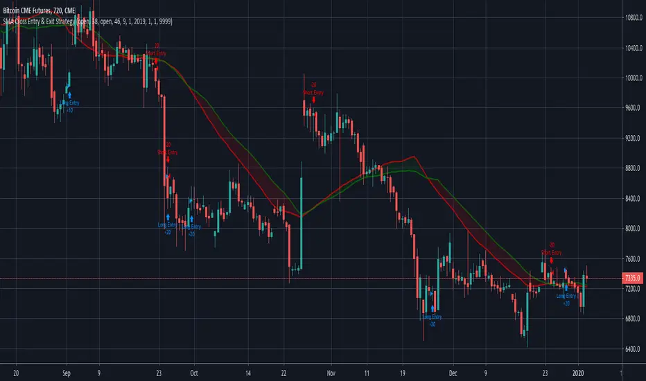 Notice: When the SMA cross occurs, you have to wait till the next candle before TradingView Strategy will print the "Long Entry" or "Short Entry" to the screen