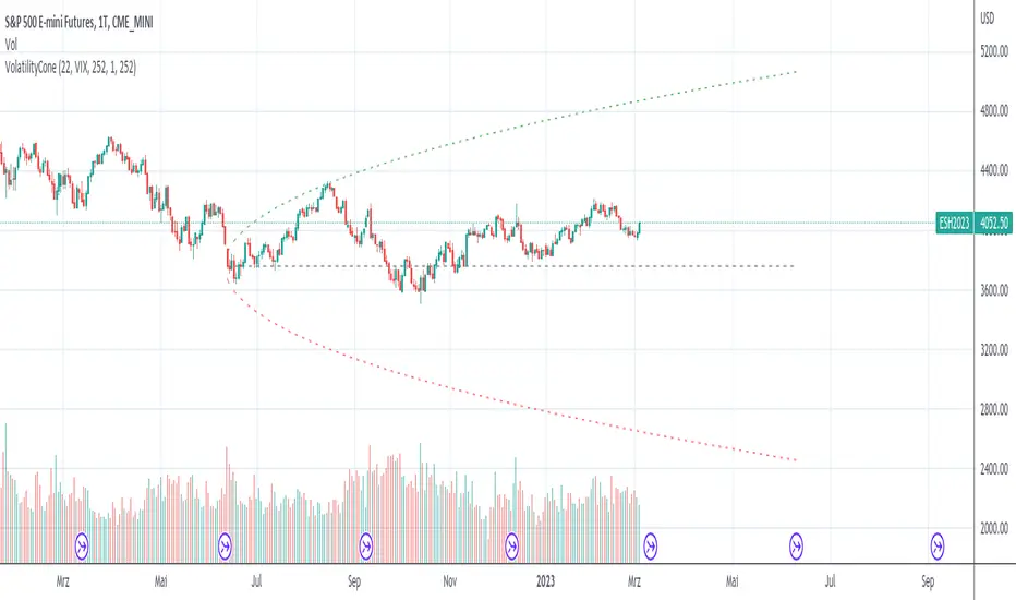 This volatility cone draws the implied volatility as standard deviations from a measurement date.For best results set measurement date to high volume bars.