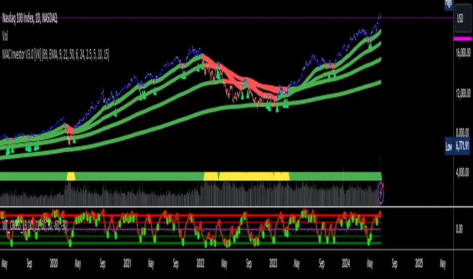 - Moving Averages (MA): Plots three moving averages and colors them based on their trend direction.